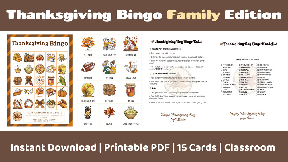 Fun and easy Thanksgiving Bingo game for families and kids. Printable, instant download, perfect for holiday gatherings.