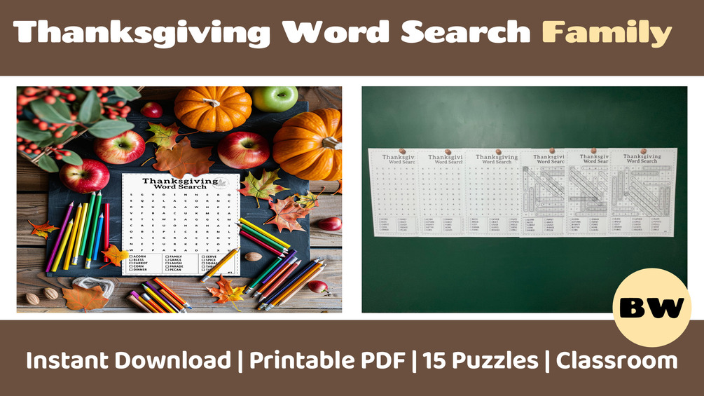 Thanksgiving Word Search Game – Family Edition | 15 Puzzles | Printable PDF (Black & White)
