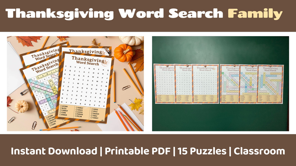 Thanksgiving Word Search Game – Family Edition | 15 Puzzles | Printable PDF
