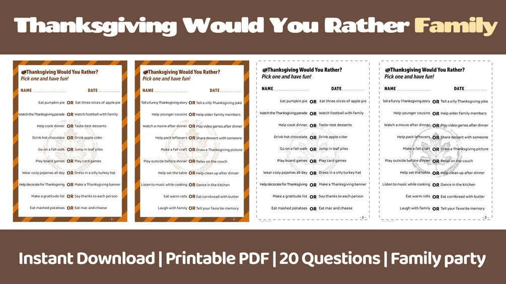 You’ll get a printable PDF with 20 family-friendly “Would You Rather?” Game (Color / B&W).